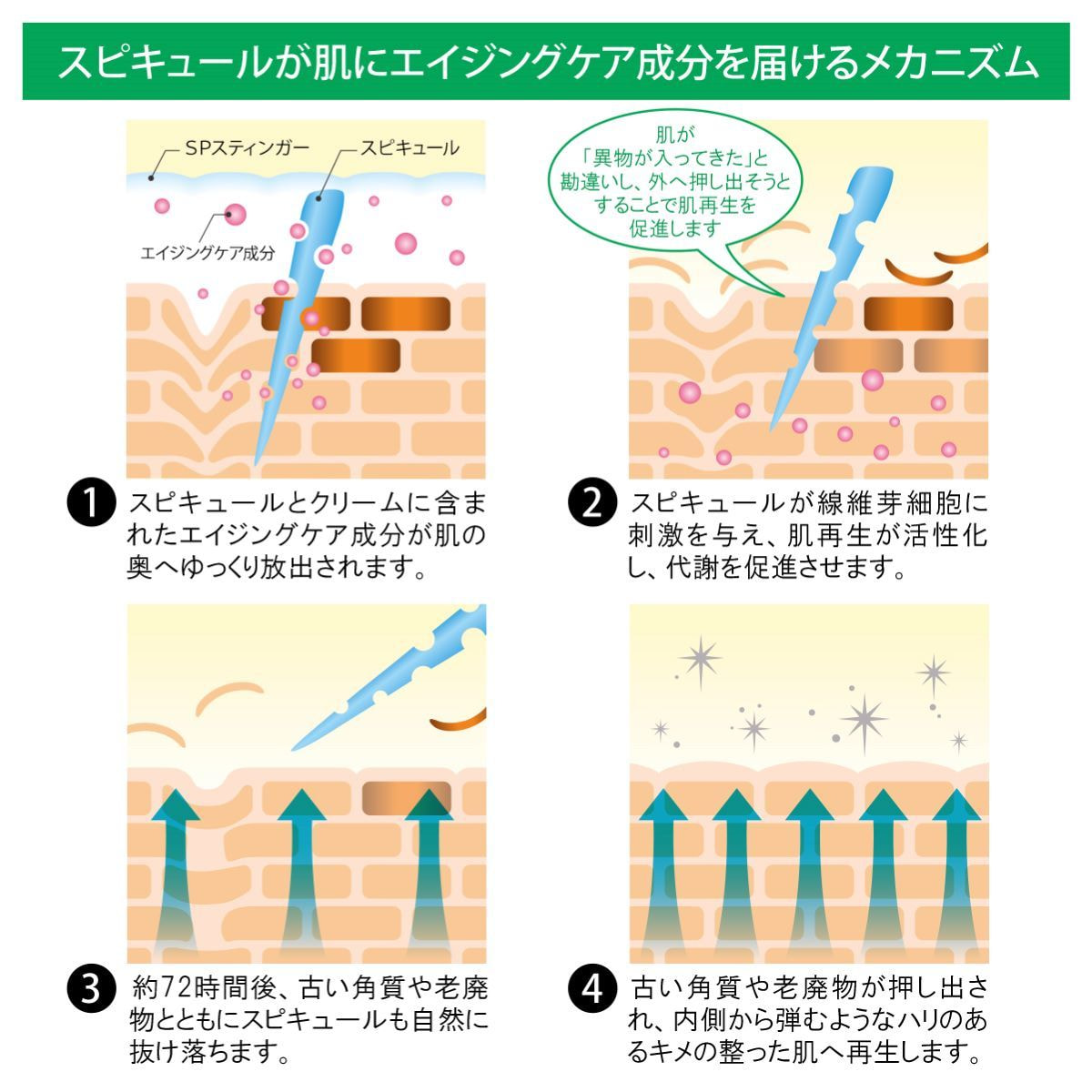 ●スピキュールが肌に吸収されることによって、チクチクする微細な刺激を感じる場合がございます。また、翌朝の洗顔時にも感じる場合もございます。